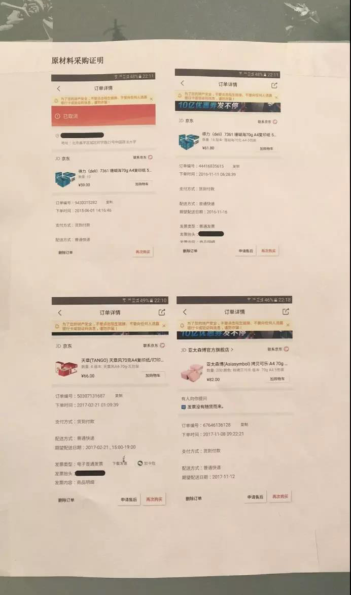 為了證明自己列出的數(shù)據(jù)是真實的,老板還附上了從正規(guī)電商渠道購紙的付款頁面截圖,用5張圖片表示從2015年以來,紙張價格在不斷上漲。