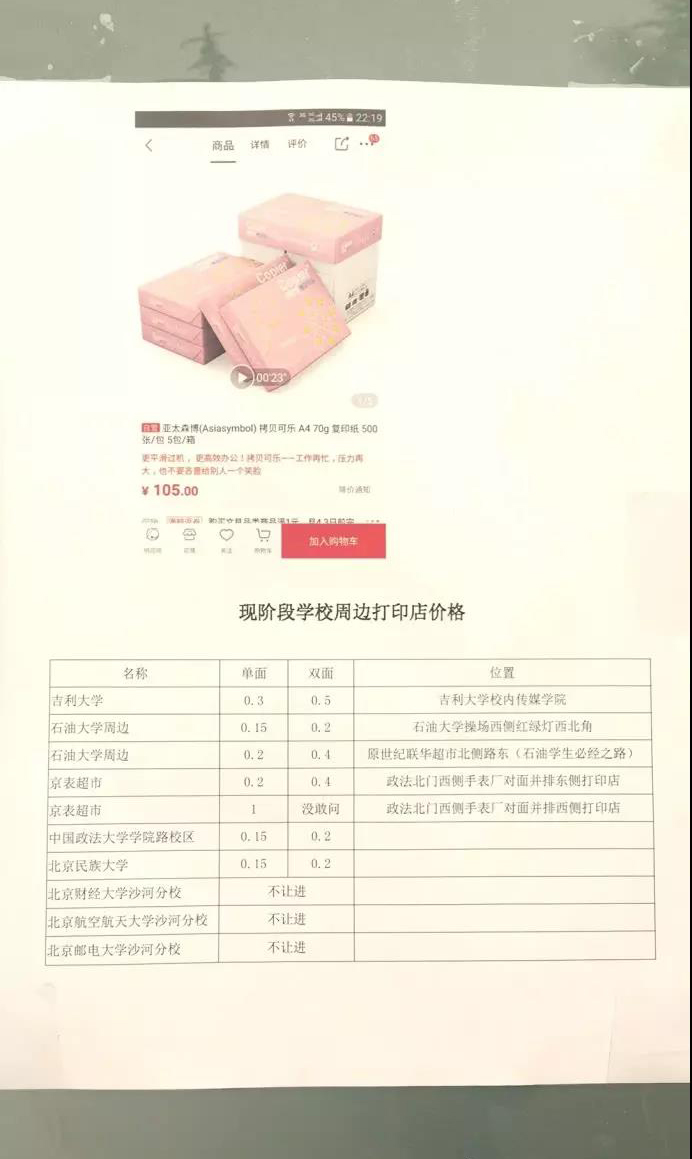 最后,老板用表格盤點了周邊高校學(xué)校打印店價格,幾乎涵蓋了政法大學(xué)周邊所有的打印店。在有些大學(xué)后面,老板備注上“不讓進”、“不敢問”等話,這讓網(wǎng)友們表示很心疼,“老板為了做競品分析也是拼了!”也有法大學(xué)生留言:“其實嘛,只不過漲個價而已,而且漲幅也不大,店主何苦那么小心翼翼,我們法大學(xué)子又不會吃了你。”